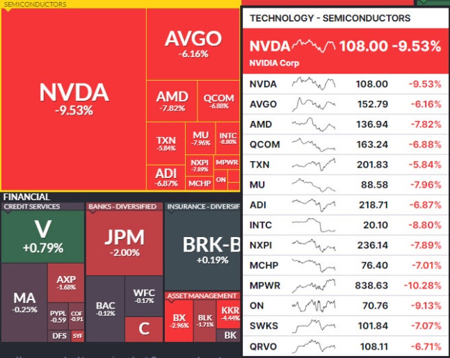 반도체 대장주인 엔비디아 주가가 고꾸라지면서 다른 반도체 역시 일제히 급락했다. 인텔도 8.8% 급락했고, 인프라 반도체 솔루션 업체 마벨테크놀로지도 8.16 % 하락했다. 이외 마이크론 테크놀로지(-7.96%), AMD(-7.82%), 브로드컴(-6.16%) 퀄컴(-6.88%)도 6~7%대로 뚝 떨어졌다. 미국 최대 반도체 ETF인 반에크 반도체(SMHETF는 7.5% 떨어지며, 2020년 3월 이후 가장 큰 낙폭을 기록했다.