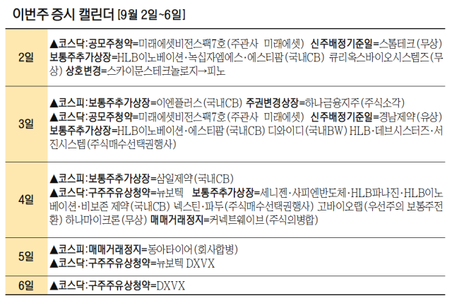 9월 첫째주 국내 증시에는 신규 상장하는 기업이 소강 국면에 들어간 가운데, 기업인수목적(스팩‧SPAC)인 미래에셋비전스팩7호가 공모주 청약 일정을 소화한다. 와이제이링크, 한켐, 제닉스 등의 기업은 기관투자가 대상 수요예측 일정을 진행하며 기업공개(IPO) 절차에 본격 돌입한다.