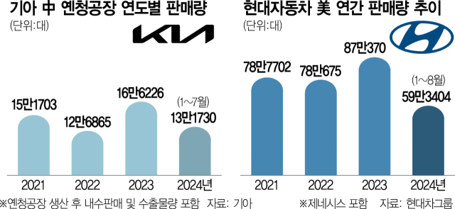 현대차그룹의 미국 판매는 가파르게 증가하고 있다. 현대차·기아는 미국 자동차 시장에서 올해 8월 16만 1881대를 팔았는데 이는 지난해 같은 기간보다 12.7%가 늘었다. 특히 월간 판매량이 16만 대를 돌파한 것은 2021년 5월, 지난해 8월에 이어 세 번째다. 업체별로 보면 현대차가 21.2% 급증한 8만 6664대, 기아가 4.3% 증가한 7만 5217대를 판매했다.