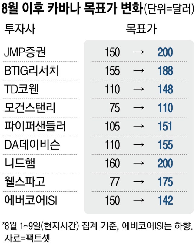 팩트셋 등 집계를 보면 최소 8곳 주요 투자사들이 회사 목표가를 높였으며 이 중 JMP증권은 카바나 목표가를 200달러로 상향했다. 8일 종가 대비 50% 추가 상승이 가능하다고 본 셈이다.